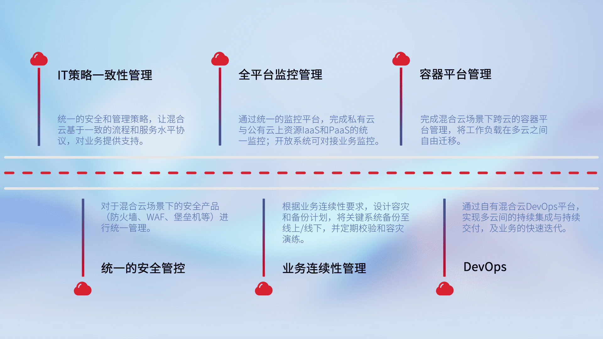 通过多云纳管,,,,以统一的资源数据模型把客户的云资源进行抽象和封装,,进而实现对多云资源的统一操作,,保障云资源管理的可靠性、、、稳定性与可用性。。量身定制化运维内容,,配置、、、、开发运维、、、、补丁管理、、、备份、、、、监控、、认证和访问管理、、、审计和日常巡检等,,保障在用云过程中的可靠度,,,,稳定度以及高可用率。。