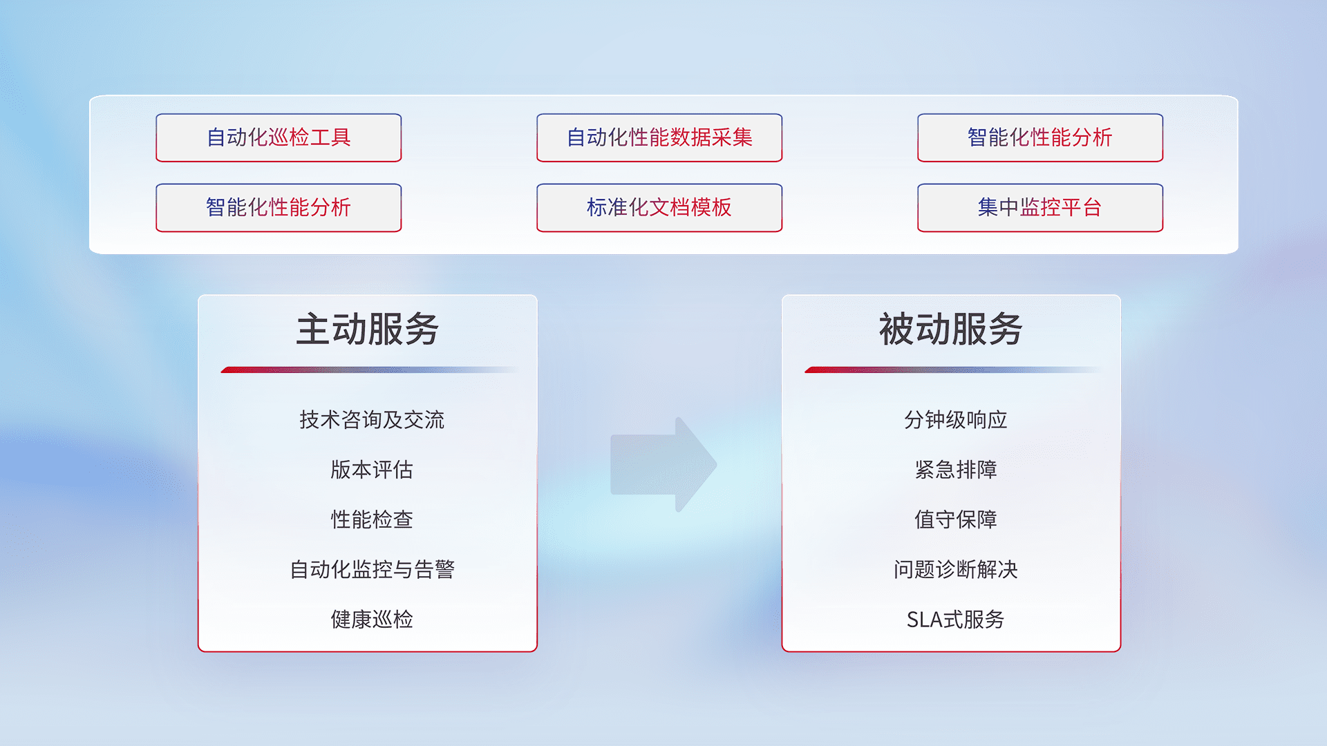 智能化工具和标准化文档,,,,保障服务质量,,提供主动服务(包含技术咨询、、、、版本评估、、性能检查、、自动化监控与告警、、健康巡检)和被动服务包含(分钟级响应、、、紧急排障、、、值守保障、、问题诊断解决、、SLA服务)。。
